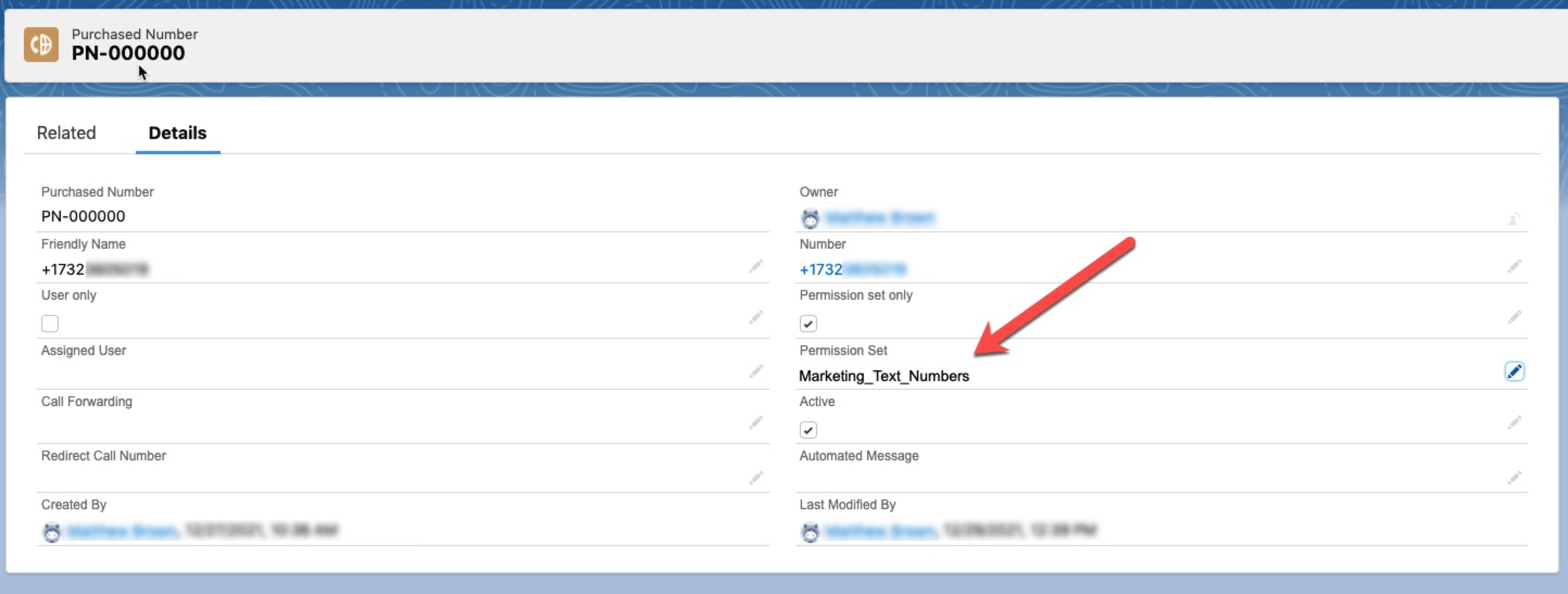 Purchased numbers can also be assigned to groups via custom Permission Sets. To assign a number to a group, first create a custom Permission Set. Then using the Permission Set API Name, add it to a purchased number. In this example, we assigned the number to the “Marketing_Text_Numbers” Permission Set. And the Permission Set was added to a marketing user’s profile. When the user sends a text, it will pick this From Number automatically.