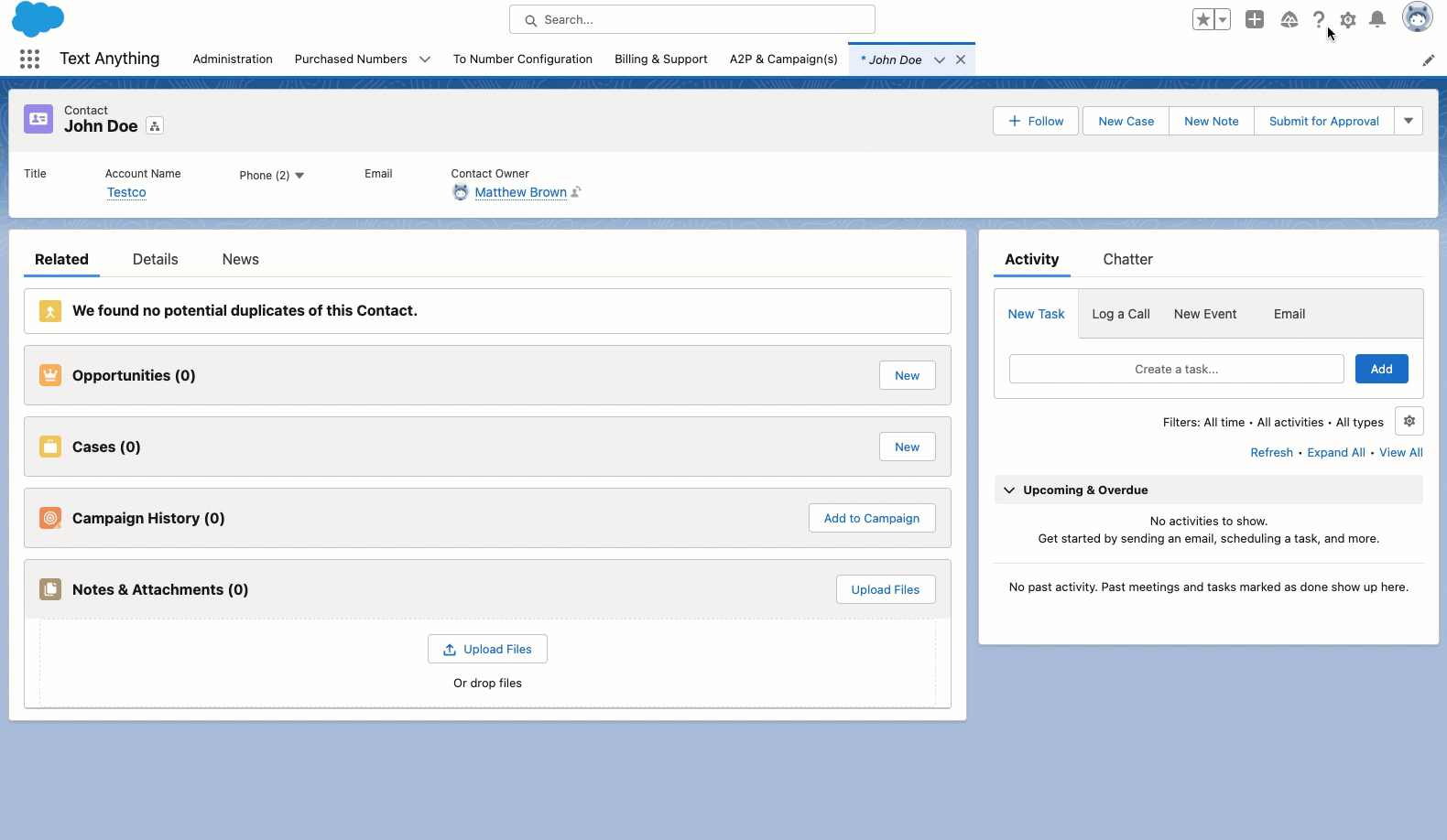 In addition to the Setup Wizard, to text from your Salesforce org you will need to add the Text Anything Chat Panel (which is a Salesforce Lightning Web Component) to a page layout on an object which you intend to send text messages to. For example, the most common use case is to put the Chat Panel on the Contact layout and select “mobile” phone as the default number for which to send text messages to. Instructions to add the component are as follows: